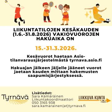 Liikuntatilojen kesäkauden (1.6.-31.8.2026) vakiovuorojen hakuaika on 15.-31.3.2026. Kesävuorot haetaan Asio-tilanvarausjärjestelmästä...