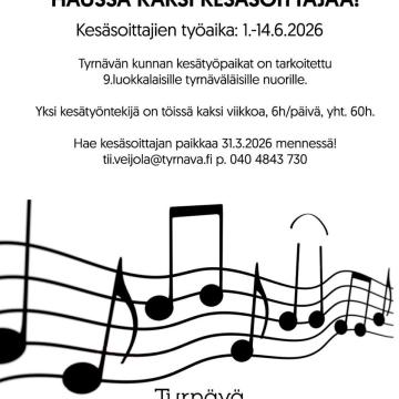 HUOMIO TYRNÄVÄLÄISET KESÄTÖITÄ ETSIVÄT 9.-LUOKKALAISET NUORET! Haussa kaksi kesäsoittajaa AJALLE 1.-14.6.2026! 🎵💚 Työtehtävän kuvaus: etsimme...