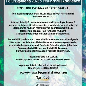 Perunagalleria 2026 x Perunahalli Experience! 🔥💯 Tyrnäväläinen perunahalli muuntautuu taiteen näyttämöksi heinäkuussa 2026. Ammattitaiteilija! Hae...