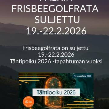 Palkin frisbeegolfrata on suljettu 19.-22.2.2026 Tähtipolku 2026 -tapahtuman vuoksi. Tähtipolku 2026 on koko perheen elämyksellinen reitti, jossa...