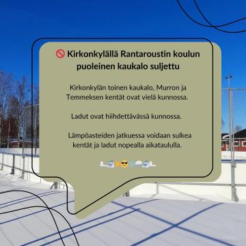 Kirkonkylällä on Rantaroustin puoleinen kaukalo suljettu. Toinen kaukalo, Murron ja Temmeksen luistelukentät ovat vielä kunnossa. Ladut on...
