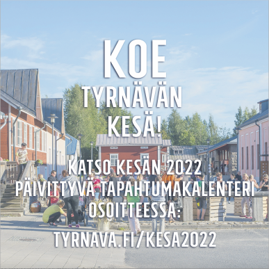 Julkaistu 06.06.2022 Koe Tyrnävän kesä 2022 – seuraa kesän päivittyvää ohjelmaa! TOUKOKUU 2.5.–31.5.2022 klo 12.00–19.00 Sakari Hintsalan Maisemassa-näyttely Myllykirjastossa klo 12.00–19.00 Taidekokeiluja-taidepajojen näyttely lehtisalissa 11.5.2022 klo 18.00–20.00 Kyläfoorumi ja Pohjoista Valoa Markkuun kylällä KESÄKUU Jatkuvaa toimintaa: - Koivula-kahvit tiistaisin klo 15–17 Koivulassa - Petri Puurusen Pohjoista Valoa -valokuvanäyttely Luonto- ja hyvinvointitalo Peukaloisessa Markkuulla - Liikuntavuoro keskiviikkoisin klo 15–16 Rantaroustin koululla - Kunnan kesäkerhot 6.6.–22.6. Murron, Rantaroustin ja Temmeksen kouluilla - Toiminnallinen treeni maanantaisin klo 18–19 kirkonkylän urheilukentällä - Porrastreenit keskiviikkoisin klo 18 Kotihalmeen mäellä. - Jalkapallokoulu 5–13-vuotiaille kesäkuussa tiistaisin ja torstaisin klo 16–19.15 urheilukentällä/Rantaroustin koululla - Nuorten palloilu 13–17-vuotiaille maanantaisin klo 18.30–20 Kuulammen liikuntasalissa - Kahvakuulaharjoitukset maanantaisin ja keskiviikkoisin klo 18.30–19.30 Kirkkomännikön koululla - Karateharjoitukset: maanantaisin junnukarate klo 17–19 ja yli 14-vuotiaiden karate klo 19–21.30 sekä keskiviikkoisin muksukarate klo 17–18, junnukarate klo 18–19.30 ja yli 14-vuotiaiden karate klo 19.30–21.30 Kirkkomännikön koululla - Maija Liisa Saarelan ja Pirkko Tihisen näyttely Taide on iloa eilen, tänään, huomenna Myllykirjastossa 1.6.2022 Kesänportti klo 12–19 Tyrnävän torilla: - Lähituotetori - Tyrnävän Tarinapolun avajaiset - Kuulammen koulun bändikonsertti - Peltolan luovan toiminnan kerho esittää laulun ja runon - Taukojumppa, Annukka Suotula - Paavo Niskasaari lukee uusinta kirjaansa Eevertti-hiiri ilmojen teillä ja vesillä - Paneeli: Miksi on tärkeää, että yhteisössä on aktiivisia yhdistyksiä - Nuojuan teatteripaja esittää: Maatila lomailee - Elias Kvistin lavashow ja lähitaikuutta - Miina ja Manu seikkailevat alueella 3.6.2022 - Liikkuva aikuinen -lentopallo (KKI) naisille ja miehille perjantaisin klo 20–22 ja sunnuntaisin klo 19–21 Kuulammen liikuntahallilla - Liikkuva aikuinen -lentopallo (KKI) naisille ja miehille keskiviikkoisin klo 19–21 Temmeksen liikuntasalissa/Haurukylä. - KKI-futis tiistaina ja torstaina klo 19–21 kirkonkylän urheilukentällä - KKI-sähly keskiviikkoisin klo 19–20.30 Rantaroustin liikuntahallilla 4.6.2022 Alakoulun päättäridisco klo 16–19 Tyrnävän seurojentalolla. 6.6.2022 - Urheiluleiri 9–13-vuotiaille 6.6.–8.6. klo 9–11 - Urheilukoulut maanantaisin ja keskiviikkoisin klo 16.30–19 kirkonkylän urheilukentällä - Erityislapsiperheiden illanvietto klo 17.00–19.30 seurakunnan kesäkodilla - Salibandyleiri 2013–2016-syntyneille 6.–10.6. klo 9.30–15 Rantaroustilla - Alkeis- ja jatkouimakoulut 6–12-vuotiaille Zimmariin 6.–10.6. 7.6.2022 - Liikkuvuutta ja lihaskuntoa kaikenikäisille kesäkuussa joka tiistai klo 10–11 Temmes-koulun areenalla, kesäkuussa joka tiistai klo 12–13 kirkonkylän urheilukentällä - Liikkuvuutta ja porrastreenejä kaikenikäisille kesäkuussa joka tiistai klo 18 Murrossa Peuranmäen kuntoportailla 8.6.2022 - Virtuaalinen kuntastrategian valmistelutyöpaja klo 12–14 ja 17–19 - Café ja Galleria Conrad avaa ovensa klo 11, Muhostie 88 10.6.2022 - Teatteri Akseli Klonk: Ryysyrannan Jooseppi klo 18 kylätalo Wäinölässä. 11.6.2022 - Tyrnävän Tempauksen 100 v. juhlapeli klo 14 Tyrnävän pesäpallokentällä: Tyrnävän Tempaus – Oulunsalon Vasama - Avoimet kylät -kahvila Kylätalo Wäinölässä - Siltojen Temmes -pyöräilytapahtuma Temmeksellä - Frisbeegolf-kuukausikisa Temmeksellä - Urholan markkinat klo 12–17 Ängeslevän Ylipäässä (Männiköntie 26): Tapahtumassa myynnissä vanhaa ja uutta, mm. vanhoja huonekaluja, käsitöitä ja paikallista hunajaa. Ohjelmassa mm. elävää musiikkia ja laukkukauppiaan vierailu Vienan Karjalasta. 13.6.2022 - Salibandyleiri 2009–2012-syntyneille 13.–17.6. klo 9.30–15 Rantaroustin koululla - Alkeis- ja jatkouimakoulut 6–12-vuotiaille Zimmariin 13.–17.6. - Hippo Pesiskoulu 2014–2015 -syntyneille 13.–17.6. klo 12–13.15 ja 2012–2013-syntyneille 13.–17.6. klo 13.30–14.45 Tyrnävän pesäpallokentällä 18.6.2022 - Markkuun Kulttuurikekkerit! Café ja Galleria Conrad (Muhostie 88). Ohjelmistossa mm. suomalaista kansallisromantiikkaa sekä tuulahduksia oopperasta ja operetista. 20.6.2022 - Salibandyteholeiri 2006–2008-syntyneille ja kokeneille pelaajille 20.–22.6. klo 11–15 Rantaroustilla - Nukketeatteri Pikku Kulkurin asuntovaunuteatteri: Kolme pukkia ja ilkeä peikko klo 9–11 Myllykirjaston piha-alue, klo 12–14 Temmeksen museoalue, klo 17–19 Suutarinjärven uimapaikka 21.6.2022 - Nukketeatteri Pikku Kulkurin asuntovaunuteatteri: Kolme pukkia ja ilkeä peikko klo 9–11 Murron koulun piha, klo 12–14 Luonto- ja hyvinvointitalo Peukaloisen piha (Markkuu), klo 17–19 Myllykirjaston piha-alue 22.6.2022 - Seurakisat klo 17 kirkonkylän urheilukentällä 28.6.2022 - Tyrnävän Tempaus – Sotkamon Jymy klo 18 Tyrnävän pesäpallokentällä 30.6.2022 - Laula kanssain -yhteislaulumatinea klo 18–19 Tyrnävän torilla HEINÄKUU 4.–29.7.2022 - Eija Nevalan näyttely Tango ja muita kuoseja julkisiin tiloihin Myllykirjastossa 2.7.2022 - Tyrnävän Tempaus – Simon Kiri klo 14 Tyrnävän pesäpallokentällä 3.7.2022 - klo 17–18.15 Hippo Pesiskoulu 2014–2015-syntyneille sunnuntaisin 3.7. alkaen Tyrnävän pesäpallokentällä - klo 18.30–19.45 Hippo Pesiskoulu 2012–2013-syntyneille sunnuntaisin 3.7. alkaen Tyrnävän pesäpallokentällä - Teatteriesitys Hiljainen Hilma klo 14 Temmeksen kotiseutumuseolla 4.7.2022 - Teatteriesitys Hiljainen Hilma klo 18 Temmeksen kotiseutumuseolla 6.7.2022 - Teatteriesitys Hiljainen Hilma klo 18 Temmeksen kotiseutumuseolla 9.7.2022 - The Aftons Café & Galleria Conradissa klo 19 - Teatteriesitys Hiljainen Hilma klo 14 Temm