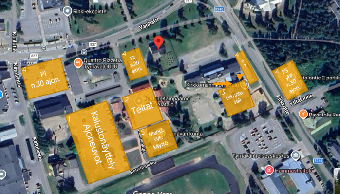 Julkaistu 13.02.2026 Tervetuloa kansalaistilaisuuteen 26.2. klo 17 – katso pysäköintijärjestelyt tästä! Kuva: Google Maps Tyrnävän kunta osallistuu viikolla 9, ma 23. – pe 27.2. koko Oulun seutua koskettavaan, Kainuun prikaatin johtamaan Northern Stone 26 -paikallispuolustusharjoitukseen, jossa toimintaa keskittyy merkittävin osin myös Tyrnävälle, erityisesti kirkonkylän ympäristöön. Harjoitusviikon aikana ja etenkin Tyrnävälle kohdistuvan harjoituksen pääpäivänä torstaina 26.2. kunnan ja kirkonkylän alueella tulee olemaan paljon puolustusvoimien ja muiden harjoitukseen osallistuvien viranomaistahojen ja -kaluston liikennettä. PYSÄKÖINTIALUEET KANSALAISTILAISUUDEN AIKANA KLO 17-19 Kansalaistilaisuuteen saapuva yleisö voi pysäköidä Tyrnävän torille (P1), Kirkkomännikön koulun pysäköintialue Kirkkotien varressa (P3), Tyrnävän seurakunnan pysäköintialue (P4) ja Myllykirjaston ja Meijerikadun alueen pysäköintialue (P5). Lisäksi Kirkkomännikön päiväkodin paikoitusalue avautuu julkiseen käyttöön päiväkotinoutoliikenteen loppuessa klo 17:00 jälkeen. Kunnantalon pysäköintialueella on pysäköinti kielletty torstaina 26.2. klo 14.00 alkaen. Kuvat: Google Maps Kuulammen koulu on seudullisen harjoituksen keskuksena to 26.2. Tyrnävän harjoituksen pääpäivänä torstaina 26.2. Tyrnävälle perustetaan aamulla klo 8 alkaen harjoitukseen kuuluva evakuointikeskus, jossa viranomaiset harjoittelevat päivän ajan muualta evakuoidun ryhmän vastaanottamista. Evakuointikeskuksena toimii Kuulammen yläkoulu, josta opetus siirretään toisiin tiloihin koko torstain 26.2. harjoituspäivän ajaksi. Opetukseen liittyvistä poikkeusjärjestelyistä tiedottaa tarkemmin Kuulammen koulu. Harjoitus ei aiheuta muutoksia Kuulammen koulun tilojen iltakäytön osalta. Harjoitus Kuulammen yläkoululla loppuu klo 16.00 mennessä. Kansalaistilaisuus ja kalustoesittelyjä to 26.2. klo 17 alkaen – tervetuloa mukaan! Torstaina 26.2. klo 17.00 alkaen toteutetaan Tyrnävällä myös harjoitukseen liittyvä kansalaistilaisuus Tyrnävän kunnantalon pysäköintialueen, kunnantalon edustan aukion sekä Kirkkomännikön päiväkodin ja koulun välisellä alueella. Kansalaistilaisuus alkaa klo 17.00–17.30 Kirkkomännikön koulun liikuntasalissa puolustusvoimien ja viranomaistahojen esittäytymisellä, jonka jälkeen kuntalaisilla on mahdollisuus tutustua erilaisiin esittelypisteisiin kunnantalon edustan aukiolla sekä puolustusvoimien ja viranomaistahojen kalustoon kunnantalon pysäköintialueella. Tervetuloa mukaan kansalaistilaisuuteen! Liitteenä olevassa kartassa kansalaistilaisuuden tapahtumapaikat merkattuna vihreällä värillä: 1) Kalustonäyttelyalue – Kunnantalon pysäköintialue (ajoneuvot) 2) Kalustonäyttelyalue – Kunnantalon etupiha (teltat, esittelypisteet yms.) 3) Kirkkomännikön koulun liikuntasali (harjoituksen esittely) 4) Kuntalaisten käytössä olevat pysäköintialueet P1, P2, P3. 5) Kunnantalon WC-tilat yleisön käytössä Tyrnävän kirkossa viikkomessu yhteistyössä Kainuun prikaatin kanssa to 26.2. klo 19 Kansalaistapahtuman ja koko harjoituspäivän päätteeksi, Tyrnävän seurakunta järjestää yhteistyössä Kainuun prikaatin kanssa klo 19 Tyrnävän kirkossa viikkomessun teemalla "Anna rauha yhteinen". Messun musiikista vastaa Jouni Pietiläinen. Mukana tilaisuudessa kapteeni Penttilä. Kenttärovasti Penna Parviainen saarnaa ja hiippakuntadekaani Juha Rauhala avustaa jumalanpalveluksessa. Lisätietoja harjoitukseen liittyen: ota yhteys kunnanjohtaja Vesa Anttilaan, p. 040 663 9859, vesa.anttila@tyrnava.fi