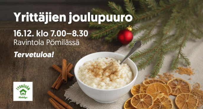 Tyrnävän Kehitys Oy tarjoaa kaikille Tyrnävällä toimiville yrittäjille maksuttoman joulupuuron tiistaina 16.12. klo 7.00–8.30 Ravintola Pömilässä.