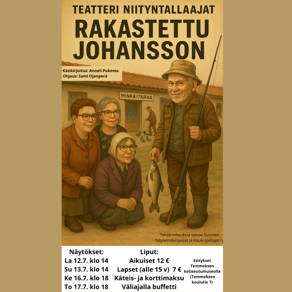 16.07.2025 18:00 - 16.07.2025 20:00 16.7. klo 18 Teatteri Niityntallaajat esittää: Rakastettu Johansson 16.7. klo 18 Teatteri Niityntallaajat esittää: Rakastettu Johansson Komedia Minkkitarhaksi kutsutun, eläkeläisten asuttaman vuokratalon pihapiirin elämästä. Esitykset Temmeksen kotiseutumuseolla os. Temmeksen koulutie 7. Liput: Aikuiset 12 € Lapset (alle 15 v. ) 7 € Käteis- ja korttimaksu Väliajalla buffetti