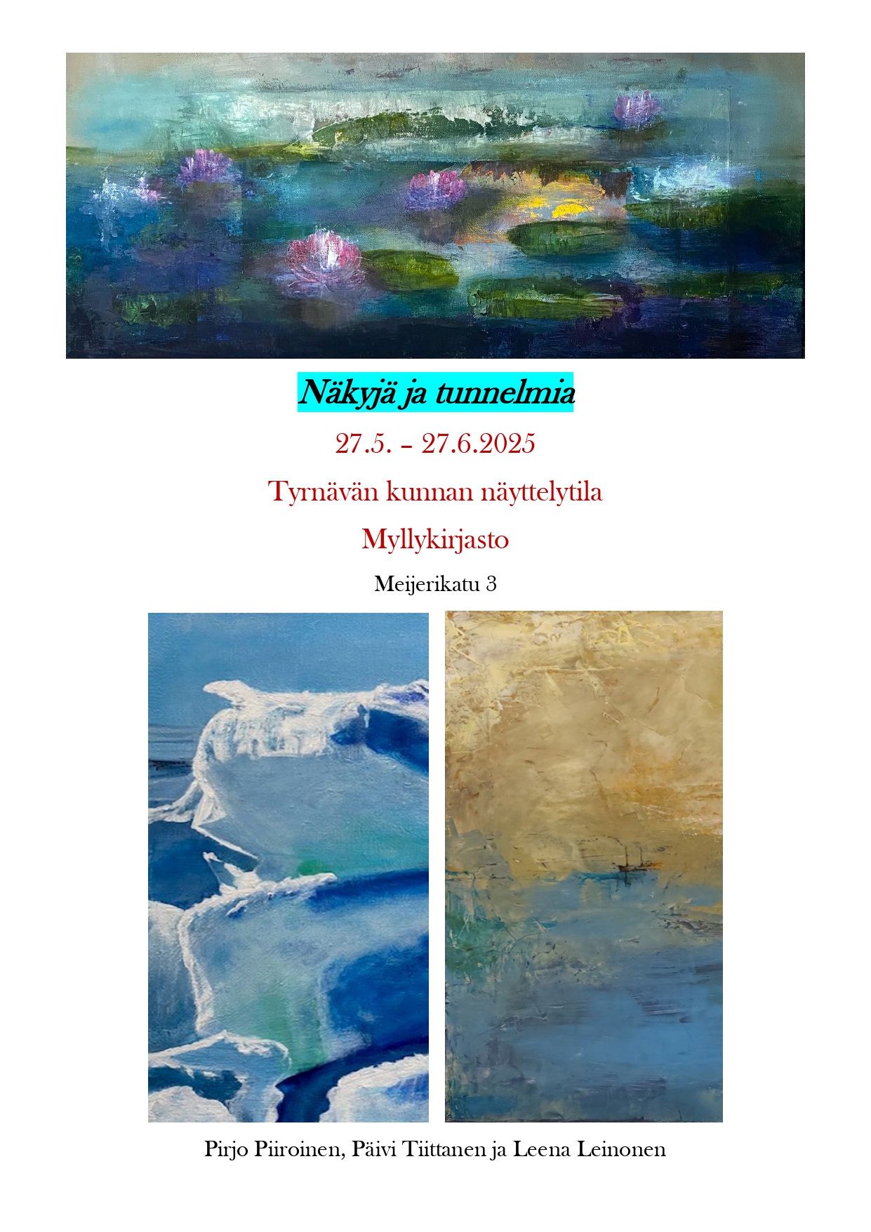 27.5.–27.6.2025 Leena Leinonen, Pirjo Piiroinen & Päivi Tiittanen: Näkyjä ja tunnelmia -yhteisnäyttely Tyrnävän kunnan näyttelytilassa