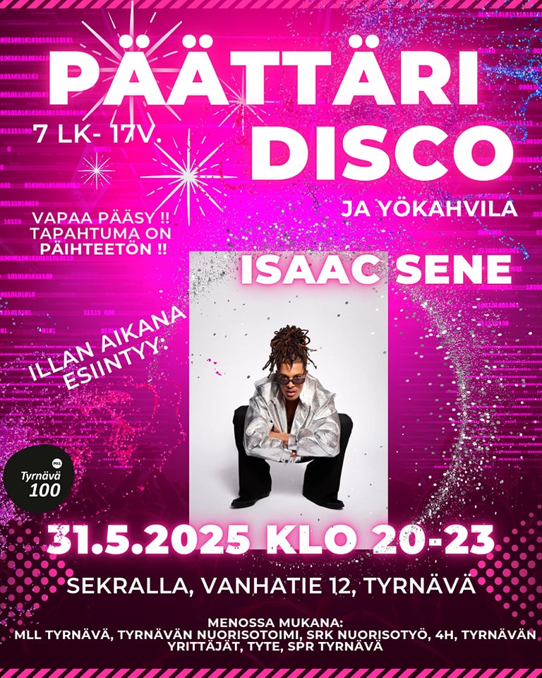 31.05.2025 20:00 - 31.05.2025 23:00 7. lk. – 17 v. päättäridisco ja yökahvila 7. lk. – 17 v. päättäridisco ja yökahvila järjestetään lauantaina 31.5.2025 klo 20–23, paikkana seurojentalo (Vanhatie 12). Tänä vuonna Tyrnävän päättäreissä on tarjolla ohjelmaa myös muille kuin alakouluikäisille! Syksyllä 7. luokan aloittavat ovat tervetulleita, koska heillä on ala-aste suoritettuna! Vapaa pääsy. Tapahtuma on päihteetön. Päättäreissä esiintyy Isaac Sene! Varmasti siis aivan mahtava ilta tiedossa. Tervetuloa! Menossa mukana: MLL Tyrnävä, Tyrnävän nuorisotoimi, seurakunnan nuorisotyö, 4H, Tyrnävän Yrittäjät, Tyrnävän Tempaus, SPR