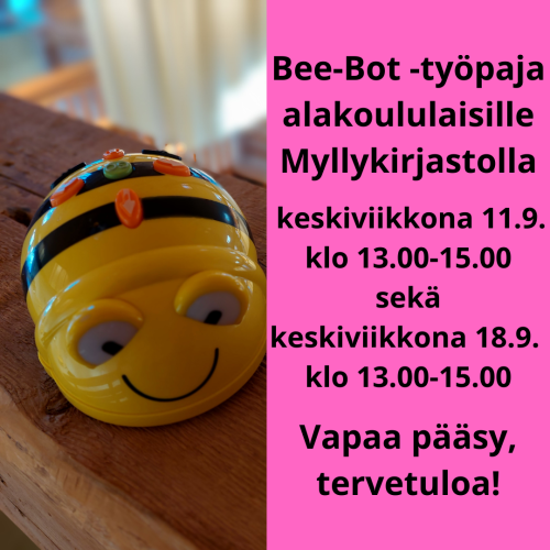 11.09.2024 13:00 - 11.09.2024 15:00 Bee-Bot työpaja alakoululaisille Bee-Bot -työpaja alakoululaisille Myllykirjastossa keskiviikkona 11.9. klo 13-15 sekä keskiviikkona 18.9. 13-15. Vapaa pääsy, tervetuloa!
