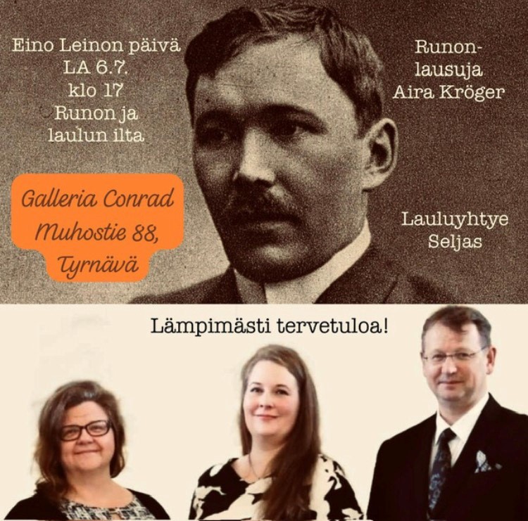 06.07.2024 17:00 - 06.07.2024 20:00 Café & Galleria Conrad: la 6.7.2024 klo 17 Runon ja laulun ilta - Eino Leinon päivä La 6.7.2024 klo 17 Runon ja laulun ilta - Eino Leinon päivä. Runonlausuja Aira Kröger ja Lauluyhtye Seljas (Riikka Saarela, sopraano, Henna-Leena Isokääntä, altto ja Pasi Hyrynkangas, baritoni) Tänä kesänä Café & Galleria Conrad juhlii 5-vuotissyntymäpäiviään! Ihastuttavaa kahvilaa ja galleriaa ylläpitävät taiteilija Jouko Korkala ja hänen vaimonsa Riitta Korkala. He saivat työstään Tyrnävän kunnan kulttuuripalkinnon vuonna 2020. FB: Cafe Conrad Instagram: cafegalleriaconrad Lisätiedot: jouko.korkala@gmail.com Muhostie 88, 91800 Tyrnävä