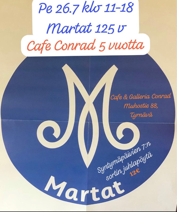 26.07.2024 11:00 - 26.07.2024 18:00 Café & Galleria Conrad: Pe 26.7.2024 klo 11-18 Martat 125v ja Cafe Conrad 5v - Syntymäpäivien seitsemän sortin juhlapöytä Pe 26.7.2024 klo 11-18 Martat 125v ja Cafe Conrad 5v - Syntymäpäivien seitsemän sortin juhlapöytä Tänä kesänä Café & Galleria Conrad juhlii 5-vuotissyntymäpäiviään! Ihastuttavaa kahvilaa ja galleriaa ylläpitävät taiteilija Jouko Korkala ja hänen vaimonsa Riitta Korkala. He saivat työstään Tyrnävän kunnan kulttuuripalkinnon vuonna 2020. Osoite: Muhostie 88, 91800 Tyrnävä FB: Cafe Conrad Instagram: cafegalleriaconrad Lisätiedot: jouko.korkala@gmail.com