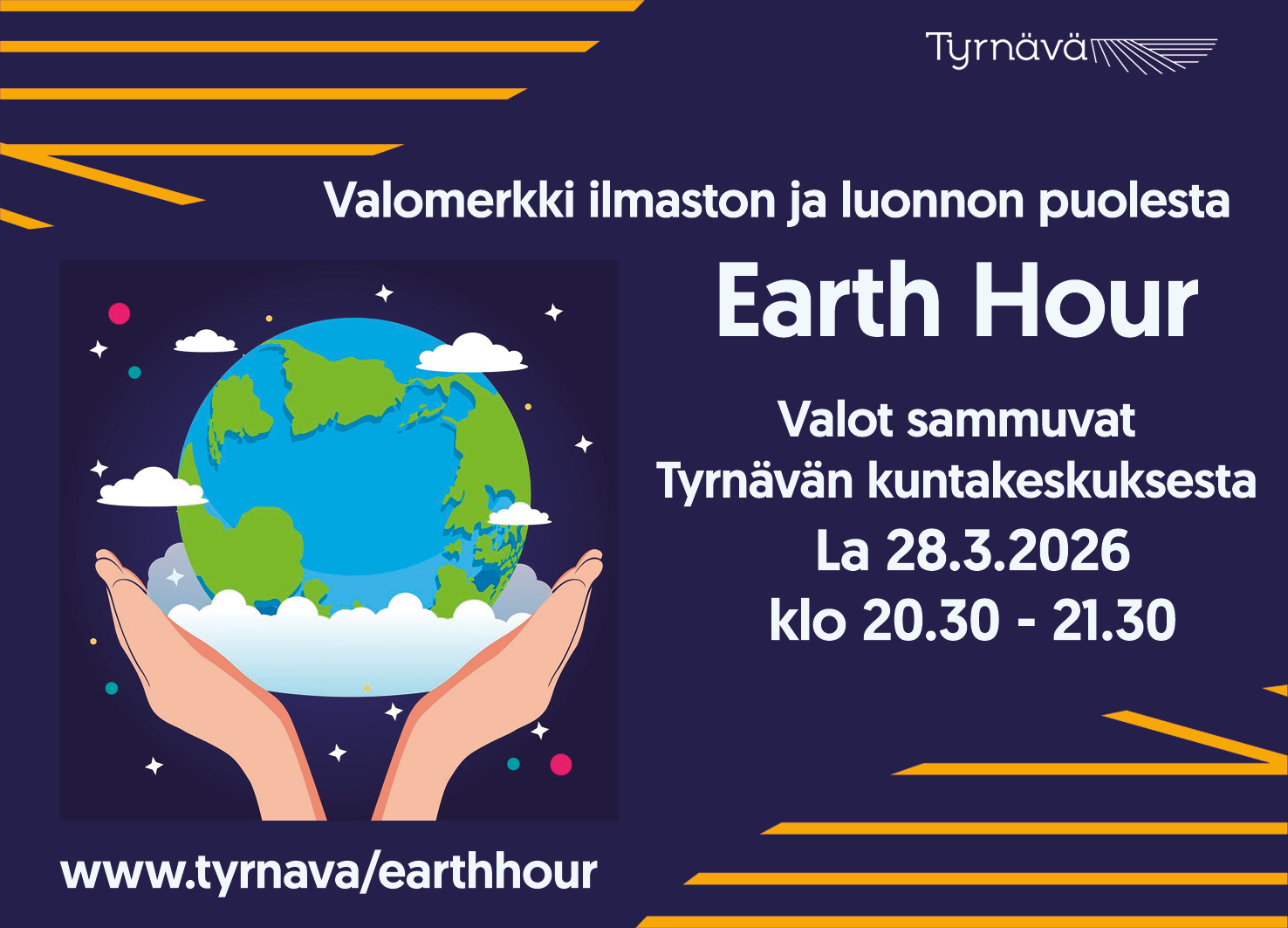 28.03.2026 20:30 - 28.03.2026 21:30 Earth Hour la 28.3.2026 klo 20.30–21.30 Valomerkki ilmaston ja luonnon puolesta – Tyrnävän kunta osallistuu maailmanlaajuiseen ympäristötapahtumaan sammuttamalla valot kuntakeskuksesta EARTH HOUR Valomerkki ilmaston ja luonnon puolesta – Tyrnävän kunta osallistuu maailmanlaajuiseen ympäristötapahtumaan sammuttamalla valot kuntakeskuksesta la 28.3.2026 klo 20.30–21.30. WWF:n Earth Hour on maailmanlaajuinen ympäristötapahtuma ja kansanliike. Valomerkin antamisen lisäksi voit osallistua Earth Houriin tekemällä arkisia tekoja luonnon ja ilmaston hyväksi. Earth Hourissa ihmisiä kannustetaan tekemään positiivisia tekoja luonnon ja ilmaston puolesta yhden tunnin ajan. Lue vinkkejä WWF:n sivuilta: www.wwf.fi/earthhour