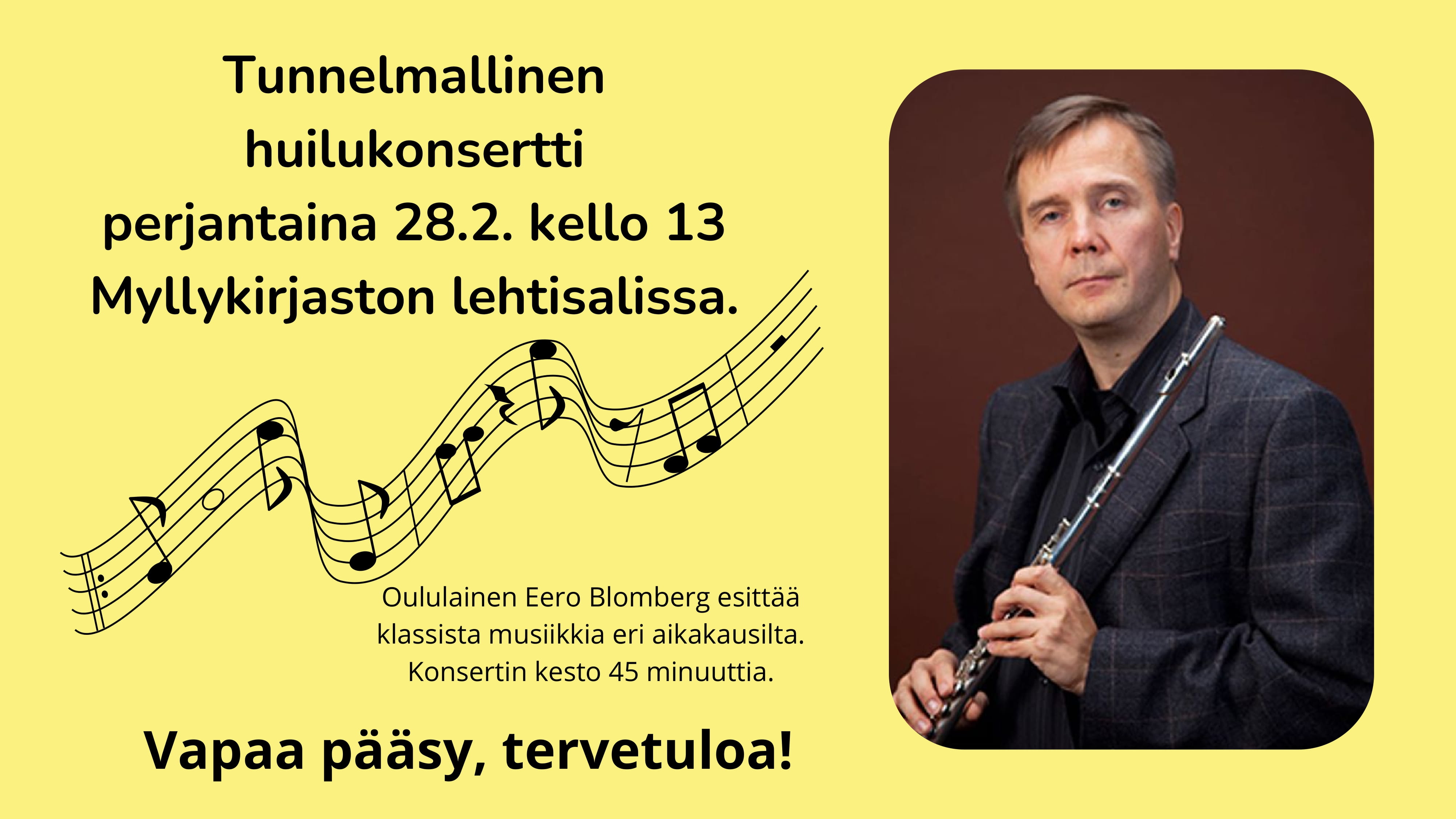 28.02.2025 13:00 - 28.02.2025 14:00 Eero Blombergin huilukonsertti Myllykirjaston lehtisalissa 28.2.2025 klo 13