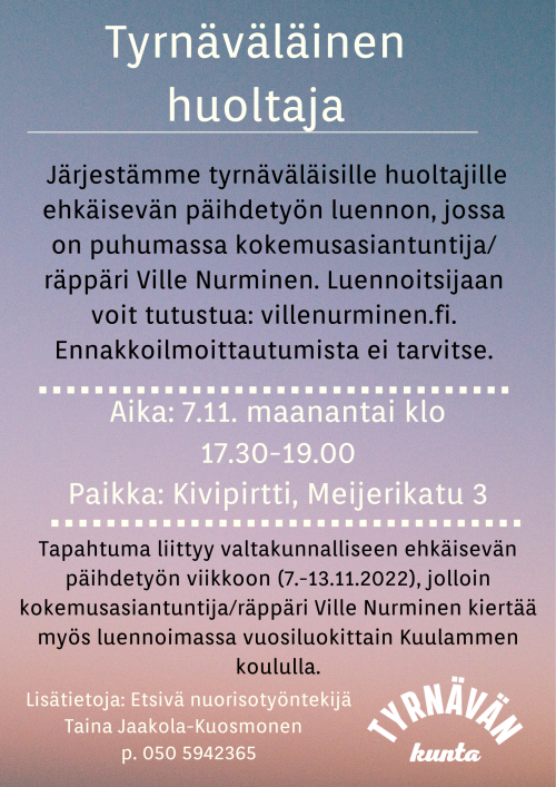 07.11.2022 17:30 - 07.11.2022 19:00 Ehkäisevän päihdetyön luento tyrnäväläisille huoltajille Valtakunnallista ehkäisevän päihdetyön viikkoa vietetään viikolla 45, 7.–13. marraskuuta. Teemaviikon tavoitteena on lisätä päihteisiin liittyvää tietoutta sekä edistää päihteettömiä elintapoja. Tyrnäväläinen huoltaja! Tervetuloa kuuntelemaan maksutonta ehkäisevän päihdetyön luentoa 7.11.2022 klo 17.30–19.00 Kivipirttiin (Meijerikatu 3)! Luennoitsijana kokemusasiantuntija, räppäri Ville Nurminen. Tilaisuus aloitetaan kahvitarjoilulla. Luennoitsijaan voi tutustua ennakkoon osoitteessa: villenurminen.fi Tapahtuman järjestäjä: Tyrnävän ehkäisevän päihdetyön työryhmä Mikäli aiheeseen liittyen herää kysyttävää, olethan yhteydessä! Taina Jaakola-Kuosmonen Etsivä nuorisotyöntekijä p. 050 594 2365 taina.jaakola@tyrnava.fi