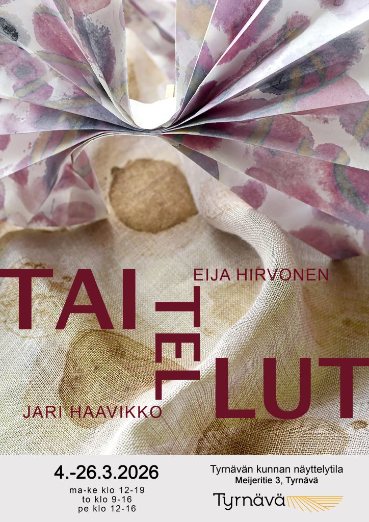 04.03.2026 12:00 - 26.03.2026 16:00 Eija Hirvonen ja Jari Haavikko: Taitellut 4.-26.3.2026 Eija Hirvosen ja Jari Haavikon taidenäyttely Taitellut Tyrnävän kunnan näyttelytilassa 4.-26.3.2026. Eija Hirvosen ja Jari Haavikon taidenäyttely Tyrnävän kunnan näyttelytilassa 4.-26.3.2026. TAITELLUT Syksyllä 2025 valmistui Eija Hirvosen videoteos Kirkkaan päivän rakennelma. Se kertoo rakentamisesta, erityisesti taideteoksen rakentumisesta. Videolla kuvataan amerikkalaisen taidemaalarin Agnes Martinin työskentelyä, sitä, miten ja miksi hän maalasi, ja miltä hänen maalaustensa katsominen tuntuu. Samaan aikaan videolla näkyy, kuinka kädet maalaavat paperia, ja paperista taitellaan origamigerbera. Se on kukka Agnes Martinille. Origamin tekijä videolla on Jari Haavikko. Kirkkaan päivän rakennelma on nähtävillä Tyrnävän kunnan näyttelytilassa. Videon lisäksi tilassa on esillä Haavikon paperitöitä ja Hirvosen kankaasta ja langoista ommeltuja ja kudottuja teoksia. Osassa teoksista yhdistyvät molempien tekijöiden materiaalit. Näyttelyn yhteisenä lähtökohtana on taitteleminen. Sanakirjan mukaan taitteleminen tarkoittaa: ”Muotoilla tai liikutella esinettä siten, että siihen muodostuu taitteita.” Synonyymisanakirja ehdottaa saman kaltaista toimintaa merkitseviksi sanoiksi: ”laskostaa,taittaa kokoon, nostaa pystyyn, viikata, taittaa.” Miten eri tavoilla materiaalit taipuvat taittamiseen? Olemme näyttelyssä myös halunneet tutkia sitä, kuinka teos taittuu tilaan ja kuinka kummankin tekijän teokset voivat taipua yhteistyöhön. Kun teokset laskostuvat toistensa lomaan, rakentuu uusi yhteinen teos. Eija Hirvonen on oululainen kuvataiteilija, joka on valmistunut vuonna 2009 kuvanveiston ja ympäristötaiteen osastolta Glasgow School of Art -taideakatemiasta Skotlannissa. Eija asuu Oulussa ja työskentelee työhuoneellaan Hiukkavaaran K2-taiteilijatalossa, mutta yhteys Skotlantiin on edelleen tärkeää. Tyrnävällä Eija on ollut mukana kolmessa Pirkolan tilan Pottuhalli-näyttelyssä. Jari Haavikko on myös ollut mukana Pottuhalli-näyttelyiden työryhmässä, aluksi valaisijana ja vuonna 2021 näyttelyssä yhtenä taiteilijoista. Haavikko on työskennellyt valoteknikkona ja valosuunnittelijana Oulussa ja osallistunut valokuva- ja taidenäyttelyihin. Valokuvaajan ammattitutkinnon hän suoritti 2008. https://www.eijahirvonen.fi/ https://jarihaavikko.fi/