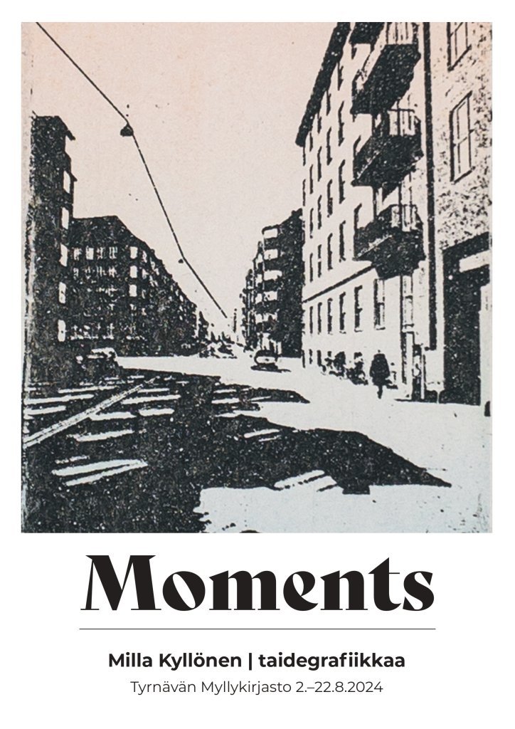 03.08.2024 09:00 - 22.08.2024 16:00 Elokuussa 3.-22.8.2024 Tyrnävän kunnan näyttelytilassa Milla Kyllösen taidenäyttely Moments Elokuussa 3.-22.8.2024 Tyrnävän kunnan näyttelytilassa nähdään Milla Kyllösen taidenäyttely Moments. Esillä taidegrafiikkaa. "Moi, olen Milla, Jyväskylässä asuva Tyrnävältä kotoisin oleva AD ja graafinen suunnittelija. Päivätöitteni rinnalla teen taidegrafiikkaa. Tutustuin ensi kerran grafiikkaan muotoiluopintoihini kuuluneella kurssilla ja innostuin heti tuosta hitaasta ja vähän käsityöläisestä prosessista ja lähdin hankkimaan oppia kansalaisopiston kursseilta. Olen harrastanut taidegrafiikkaa vuodesta 2003 ja kartuttanut osaamistani kursseilla eri puolilla Suomea. Tällä hetkellä työskentelen omatoimisesti Grafiikka- ja valokuvakeskus Ratamolla Jyväskylän Veturitalleilla. Aiheet teoksissani ovat pääasiassa arkkitehtuurissa ja ympäristön graafisissa elementeissä, kuten voimalinjoissa, varjoissa ja heijastuksissa ja luonnossa. Pysähtyneissä arkisissa hetkissä. Viime aikoina myös usein linnuissa. Teokset eivät ota kantaa, ne ovat pelkistettyjä yksityiskohtia ympäristöstäni ja näkemistäni asioista, koetuista hetkistä ja tilanteista. Tekniikoista käytän eniten etsausta ja akvatintaa sekä fotoetsausta, jossa yhdistän valokuvia muihin taidegrafiikan menetelmiin. Viime aikoina olen tehnyt myös polymeerigravyyritöitä ja opiskellut serigrafiaa. Vaikka olen tehnyt grafiikkaa jo vuosia, on omien töiden esille laittaminen jännittänyt kovasti. Vuosi sitten pääsin mukaan “Max. 21” -ryhmänäyttelyyn Jyväskylään. Näyttelyn myötä Jyväskylään keskustaan saatiin tila, La Fiaba -galleria, missä on jatkuvaa matalan kynnyksen taidenäyttelytoimintaa edelleen joka kuukausi vaihtuvine näyttelyineen. Tänä vuonna olen mukana myös Konstrundan-tapahtumassa syyskuussa Jyväskylässä ja tammikuussa edessä on oma näyttely Kirkkonummella."