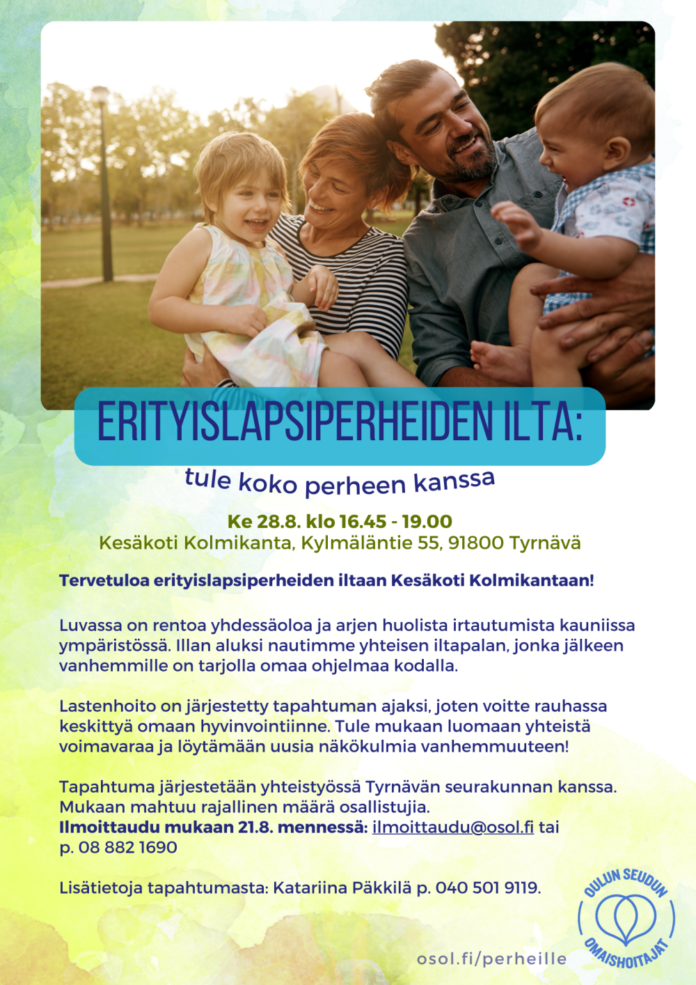 28.08.2024 16:45 - 28.08.2024 19:00 Erityislapsiperheiden illanvietto Erityislapsi ja -nuorten perheiden illanvietto kesäkoti Kolmikannassa Luvassa on rentoa yhdessäoloa ja arjen huolista irtautumista kauniissa ympäristössä. Illan aluksi nautimme yhteisen iltapalan, jonka jälkeen vanhemmille on tarjolla omaa ohjelmaa kodalla. Lasten hoito on järjestetty tämän ajan, joten voitte rauhassa keskittyä omaan hyvinvointiinne. Tule mukaan luomaan yhteistä voimavaraa ja löytämään uusia näkökulmia vanhemmuuteen! Ilmoittaudu pian mukaan mahtuu rajallinen määrä osallistujia. Tapahtuma järjestetään yhteistyössä Tyrnävän seurakunnan kanssa. Ilmoittautuminen 21.8.2024 mennessä ilmoittaudu@osol.fi tai 08 882 1690