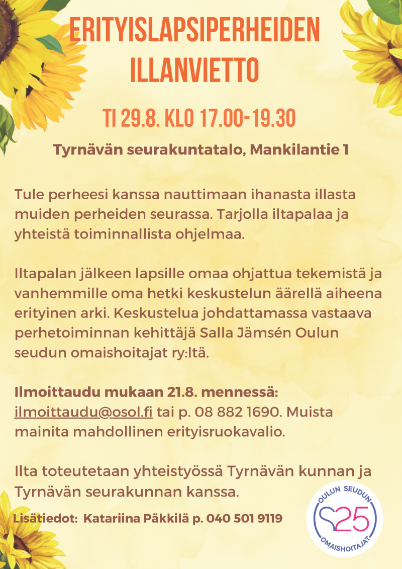29.08.2023 17:00 - 29.08.2023 19:30 Erityislapsiperheiden illanvietto ti 29.8. klo 17 Tule perheesi kanssa nauttimaan ihanasta illasta muiden perheiden seurassa. Tarjolla iltapalaa ja yhteistä toiminnallista ohjelmaa. Iltapalan jälkeen lapsille omaa ohjattua tekemistä ja vanhemmille oma hetki keskustelun äärellä aiheena erityinen arki. Keskustelua johdattamassa vastaava perhetoiminnan kehittäjä Salla Jämsén Oulun seudun omaishoitajat ry:ltä. Ilmoittaudu mukaan 21.8. mennessä: ilmoittaudu@osol.fi tai p. 08 882 1690. Lisätiedot Katariina Päkkilä 040 501 9119