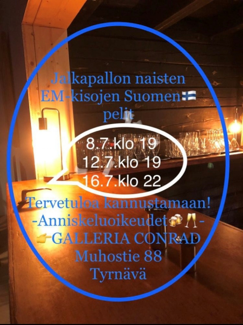 08.07.2022 19:00 - 08.07.2022 22:00 Galleria Conradissa: Jalkapallon naisten EM-kisojen Suomen pelit jättiscreeniltä Jalkapallon naisten EM-kisojen Suomen pelit jättiscreeniltä Galleria Conradissa. Bar Consul avoinna.