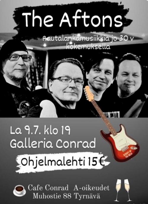 09.07.2022 19:00 - 09.07.2022 23:59 Galleria Conradissa: Rautalankaillassa The Aftonsin 30v juhlavuoden konsertti! la 9.7. klo 19 Galleria Conradissa: Rautalankaillassa The Aftonsin 30v juhlavuoden konsertti! Cafe Conrad hoitaa tarjoilut. Anniskeluoikeudet.