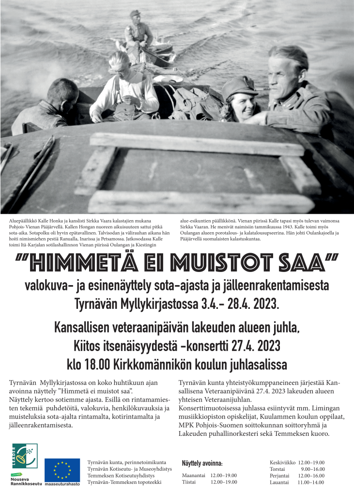 03.04.2023 12:00 - 29.04.2023 14:00 "Himmetä ei muistot saa" – valokuva- ja esinenäyttely sota-ajasta ja jälleenrakentamisesta 3.–28.4.2023 Huom. NÄYTTELY ON AVOINNA MYÖS LA 29.4. KLO 11–14 Tyrnävän kunnan näyttelytilassa Myllykirjastossa! Himmetä ei muistot saa – valokuva- ja esinenäyttely sota-ajasta ja jälleenrakentamisesta 3.–28.4.2023 Tyrnävän kunnan näyttelytilassa Myllykirjastossa. HUOM! Näyttelyyn ei pääse tutustumaan lauantaina 15.4., koska kirjastossa ei tuolloin ole paikalla henkilökuntaa. Näyttely kertoo sotiemme ajasta. Esillä on rintamamiesten tekemiä puhdetöitä, valokuvia, henkilökuvauksia ja muisteluksia sota-ajalta rintamalta, kotirintamalta ja jälleenrakentamisesta. Näyttely on avoinna Myllykirjaston aukioloaikojen puitteissa. Näyttelystä vastaavat Tyrnävän perinnetoimikunta, Tyrnävän Kotiseutu- ja museoyhdistys, Temmeksen Kotiseutuyhdistys ja Tyrnävän-Temmeksen topoteekki.