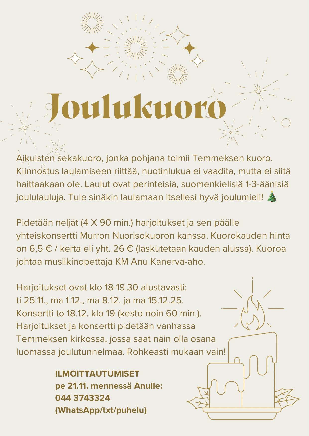15.12.2025 18:00 - 15.12.2025 19:30 Joulukuoron harjoitukset Temmeksen kirkossa Joulukuoro on aikuisten sekakuoro, jonka pohjana toimii Temmeksen kuoro. Kiinnostus laulamiseen riittää, nuotinlukutaitoa ei vaadita, vaikka ei siitä haittaakaan ole. Laulut ovat perinteisiä, 1–3-äänisiä joululauluja. Tule sinäkin laulamaan itsellesi hyvä joulumieli! 🎄 Ilmoittautumiset pe 21.11. mennessä Anulle: 044 374 3324 (WhatsApp/txt/puhelu). Pidetään neljät harjoitukset (4 x 90 min) ja niiden päälle yhteiskonsertti Murron nuorisokuoron kanssa. Kuorokauden hinta on 6,5 €/kerta eli yhteensä 26 € (laskutetaan kauden alussa). Kuoroa johtaa musiikinopettaja KM Anu Kanerva-aho. Harjoitukset ovat klo 18–19.30 alustavasti: ti 25.11., ma 1.12., ma 8.12. ja ma 15.12. Konsertti torstaina 18.12. klo 19 (kesto noin 60 min). Harjoitukset ja konsertti pidetään Temmeksen kirkossa, jossa saat näin olla osana luomassa joulutunnelmaa. Rohkeasti mukaan vain!