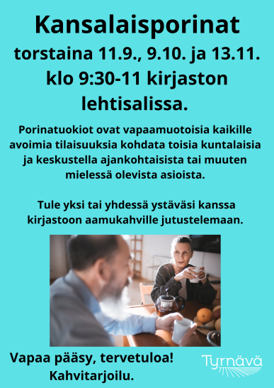 09.10.2025 09:30 - 09.10.2025 11:00 Kansalaisporinat kirjastolla Kansalaisporinat torstaisin 11.9., 9.10. ja 13.11. kello 9.30–11 kirjaston lehtisalissa. Porinatuokiot ovat vapaamuotoisia tilaisuuksia, joihin kaiken ikäiset kuntalaiset voivat tulla kohtaamaan toisia kuntalaisia ja keskustelemaan ajankohtaisista asioista. Tule yksin tai yhdessä ystäväsi kanssa nauttimaan kirjaston tarjoamista aamukahveista! Vapaa pääsy, tervetuloa!