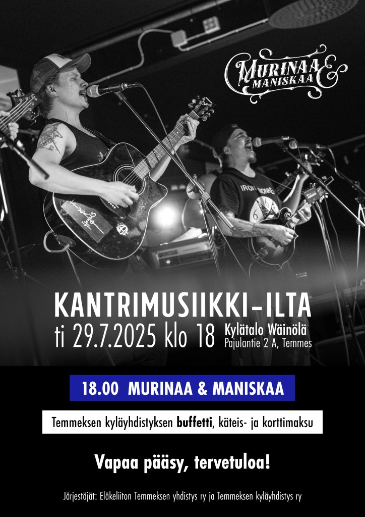 29.07.2025 18:00 - 29.07.2025 20:00 Kantrimusiikki-ilta Nyt kaivelemaan vintiltä stetsonit ja buutsit esille! Tiistaina 29.7. klo 18 alkaen kantrimusiikki täyttää kylätalo Wäinölän (Pajulantie 2 A, Temmes)! Illassa lavan ottaa haltuunsa energinen Temmeksen oma bändi Murinaa & Maniskaa! Keikka alkaa klo 18, ja siihen on vapaa pääsy. Temmeksen kyläyhdistys pitää illassa buffettia (käteis- ja korttimaksu). Lämpimästi tervetuloa nauttimaan musiikista, maukkaista tarjoiluista ja mukavasta yhdessäolosta Wäinölään! Murinaa & Maniskaa on vuonna 2021 Oulussa perustettu kuusihenkinen country-/folkyhtye, jonka musiikki perustuu mukaansatempaaviin mandoliinimelodioihin ja tarttuviin kertosäkeisiin. Yhtye on huhtikuussa julkaissut debyyttialbuminsa "Road", ja huhujen mukaan materiaalia alkaisi olla jo seuraavankin albumin tekemistä varten. Tapahtuman järjestävät Eläkeliiton Temmeksen yhdistys ry ja Temmeksen kyläyhdistys.