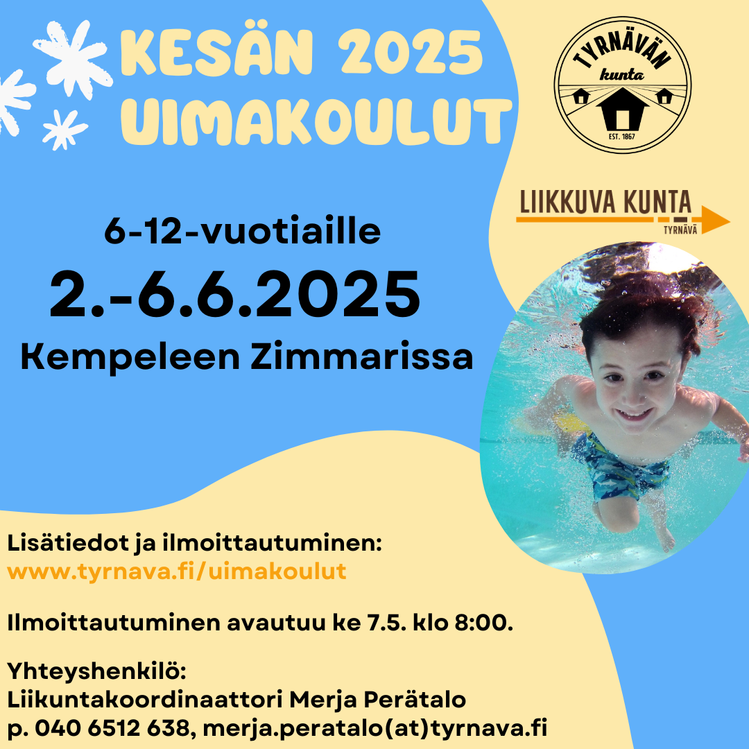 02.06.2025 11:00 - 06.06.2025 14:00 Kesäuimakoulut 6–12-vuotiaille Tyrnävän kunnan kesäuimakoulut järjestetään 2.–6.6.2025 Kempeleen virkistysuimala Zimmarissa. Lisätiedot ja ilmoittautumiset täältä. Ilmoittautuminen aukeaa ke 7.5. klo 8:00.