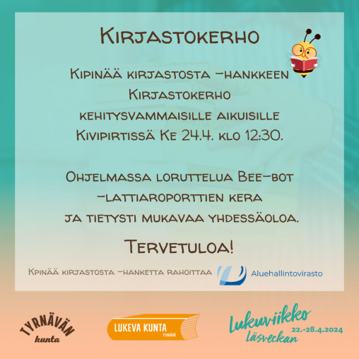 24.04.2024 12:30 - 24.04.2024 13:30 Kipinää kirjastosta -kerho Kirjastokerho tyrnäväläisille kehitysvammaisille aikuisille keskiviikkona 24.4. kello 12:30 Kivipirtissä. Ohjelmassa loruttelua Bee-bot -latttiarobottien kera ja mukavaa yhdessä oloa. Kerho on maksuton, tervetuloa!
