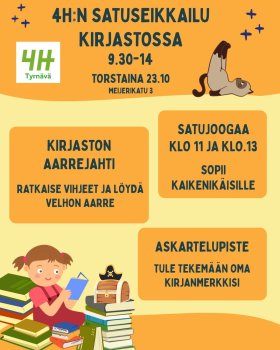 23.10.2025 09:30 - 23.10.2025 14:00 Kirjastoseikkalu ja satujoogaa kirjastolla 4H:n järjestämä kirjastoseikkailu torstaina 23.10. klo 9.30–14 Myllykirjastossa. Aarrejahti: ratkaise vihjeet ja löydä velhon aarre! Satujooga klo 11 ja 13. Sopii kaikenikäisille! Askartelupiste! Tule tekemään oma kirjanmerkkisi.