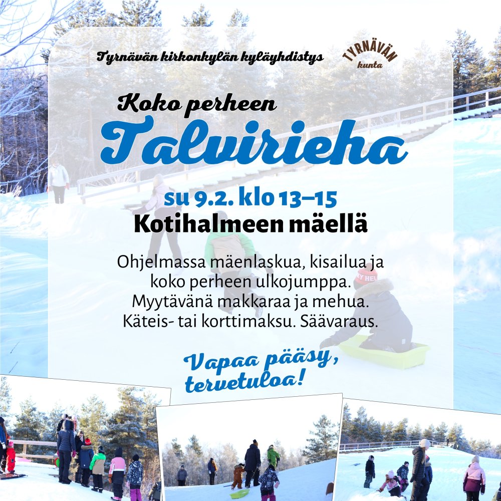 09.02.2025 13:00 - 09.02.2025 15:00 Koko perheen talvirieha Tyrnävän kirkonkylän kyläyhdistys järjestää jälleen koko perheen talviriehan sunnuntaina 9.2. klo 13–15 Kotihalmeen mäellä (Ryskykujan päässä). Ohjelmassa on muun muassa mäenlaskua, kisailua ja koko perheen ulkojumppa. Myytävänä makkaraa ja mehua, käteis- tai korttimaksu. Säävaraus. Vapaa pääsy, tervetuloa mukaan koko perheen voimin! Huomaathan, että mäen lähellä on vähän tilaa parkkeerata. Eellusmiehentien toiseen reunaan mahtuu parkkeeraamaan. Paikalle kannattaa tulla mahdollisuuksien mukaan kävellen tai vaikkapa hiihtäen! Järjestäjät: Tyrnävän kirkonkylän kyläyhdistys ja Tyrnävän kunta #laskiainen #laskiaisrieha #laskiaisrieha2025 #tyrnävänkirkonkylänkyläyhdistys #tyrnävänkunta #tyrnävä #mukavammanarjenkotikunta #mukavampiarki #meidäntyrnävä