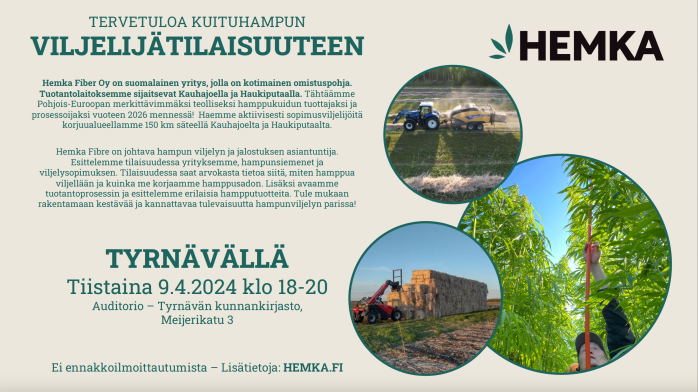 09.04.2024 18:00 - 09.04.2024 20:00 Kuljetusyrittäjä tai maatalousyrittäjä, tervetuloa ti 9.4 klo 18-20 kuituhamppuaiheiseen tilaisuuteen Tervetuloa ti 9.4 klo 18-20 kuituhamppuaiheiseen tilaisuuteen, joka on suunnattu erityisesti kuljetusyrittäjille ja viljelijöille. Tilaisuus tarjoaa kattavan ymmärryksen kuituhampusta – sen kasvusta, viljelystä ja monista käyttötarkoituksista. Olipa viljelykokemuksesi mikä tahansa, tämä tilaisuus tarjoaa arvokasta tietoa uudesta ja kannattavasta vaihtoehdosta. Mitä: Kuituhampun viljelijätilaisuus Koska: tiistaina 9.4.2024 Klo: 18:00 – 20:00 Missä: Meijerikatu 3, Tyrnävä (Kirjaston vieressä auditorio) Ilmoittautuminen: ei tarvitse Tilaisuuden järjestää Hemka Fibre Oy, joka jalostaa kuituhamppua mm. tekstiilikuiduksi sekä kuivikkeeksi Haukiputaan tehtaalla ja kesästä alkaen Kauhajoen tehtaalla. Hemka etsii yrityksiä ja sopimusviljelijöitä yhteistyöhön sekä alkavalle kasvukaudelle että tuleville vuosille. Tule mukaan oppimaan ja keskustelemaan kuituhampunviljelystä!