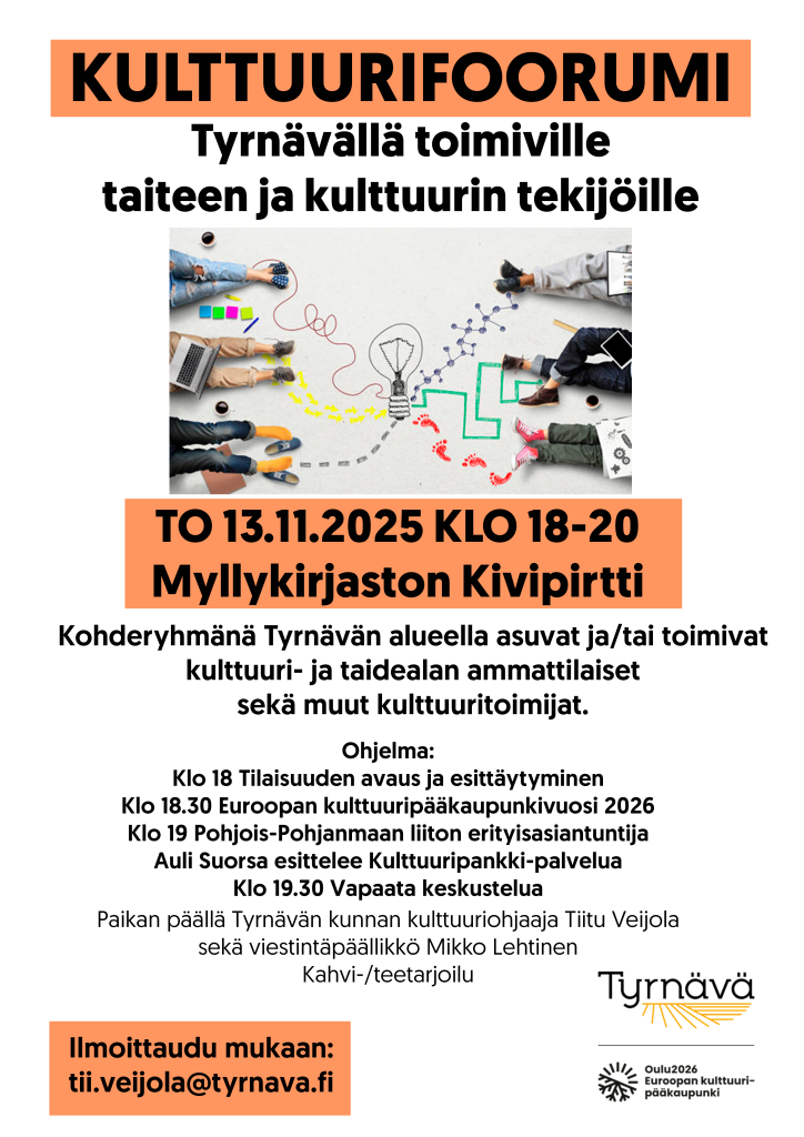 13.11.2025 18:00 - 13.11.2025 20:00 Kulttuurifoorumi Tyrnävällä toimiville taiteen ja kulttuurin tekijöille to 13.11.2025 klo 18