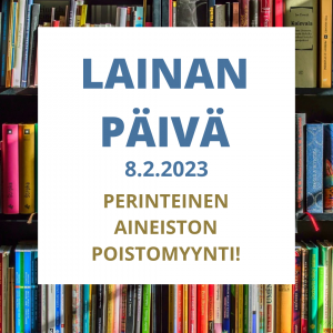 08.02.2023 12:00 - 08.02.2023 19:00 Lainan päivänä ke 8.2. Myllykirjastossa aineiston poistomyynti Myllykirjaston lehtisalissa tarjolla runsaasti elokuvia, musiikkia ja äänikirjoja. Hinnat: lehdet 20 snt/kpl, kirjat, levyt, dvd:t 50 snt/kpl