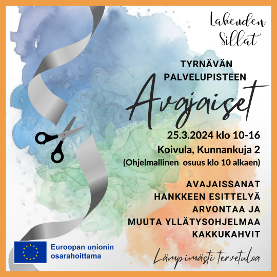 25.03.2024 10:00 - 25.03.2024 16:00 Lakeuden Sillat - hankkeen Tyrnävän palvelupisteen avajaiset maanantaina 25.3 klo 10-16 Tervetuloa Lakeuden Sillat -hankkeen Tyrnävän palvelupisteen avajaisiin 25.3. klo 10–16 Lakeuden Sillat on 1.1.2024 käynnistynyt kolmen kunnan yhteishanke, jossa luodaan Lakeuden alueelle (Kempele, Liminka ja Tyrnävä) työllistymistä edistävät matalan kynnyksen monialaiset palvelupisteet mahdollistamaan erilaisten palvelujen saanti siirryttäessä koulutukseen tai työelämään. Kaikissa palvelupisteissä palvelua tarjotaan sekä lähipalveluna että digitaalisesti. Kempeleessä ja Limingassa palvelupiste on suunnattu 15–65-vuotiaille, Tyrnävällä painopisteenä ovat alle 29-vuotiaat. Tyrnävän palvelupiste sijaitsee Koivulassa (Kunnankuja 2), missä vietämme avajaisia 25.3. Ohjelmallinen osuus klo 10 alkaen, mutta tiloihin ja palveluihin mahdollisuus tulla tutustumaan pitkin päivää klo 16 asti.