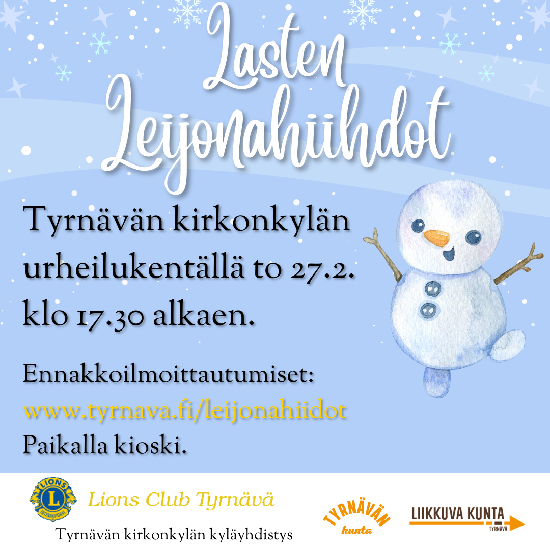 27.02.2025 17:30 - 27.02.2025 19:30 Lasten Leijonahiihdot PERUTTU TAPAHTUMA PERUTTU SÄÄOLOSUHTEIDEN VUOKSI! ️Tervetuloa kisailemaan leikkimielisesti Leijonahiihtoihin Tyrnävän kirkonkylän urheilukentälle to 27.2. klo 17.30 alkaen! ️ ️ Ennakkoilmoittautumiset Tyrnävän kunnan verkkosivujen kautta. ️Myös paikan päällä ilmoittautuminen onnistuu ennen kilpailun alkua, mutta suosittelemme ennakkoilmoittautumista tapahtuman sujuvuuden parantamiseksi. Kilpailut alkavat klo 17.30 pienimmistä hiihtäjistä. ️Kaikki osallistujat palkitaan! ️Paikalla kioski. Tapahtuman järjestäjinä Lions Club Tyrnävä, Tyrnävän kirkonkylän kyläyhdistys ja Tyrnävän kunta.