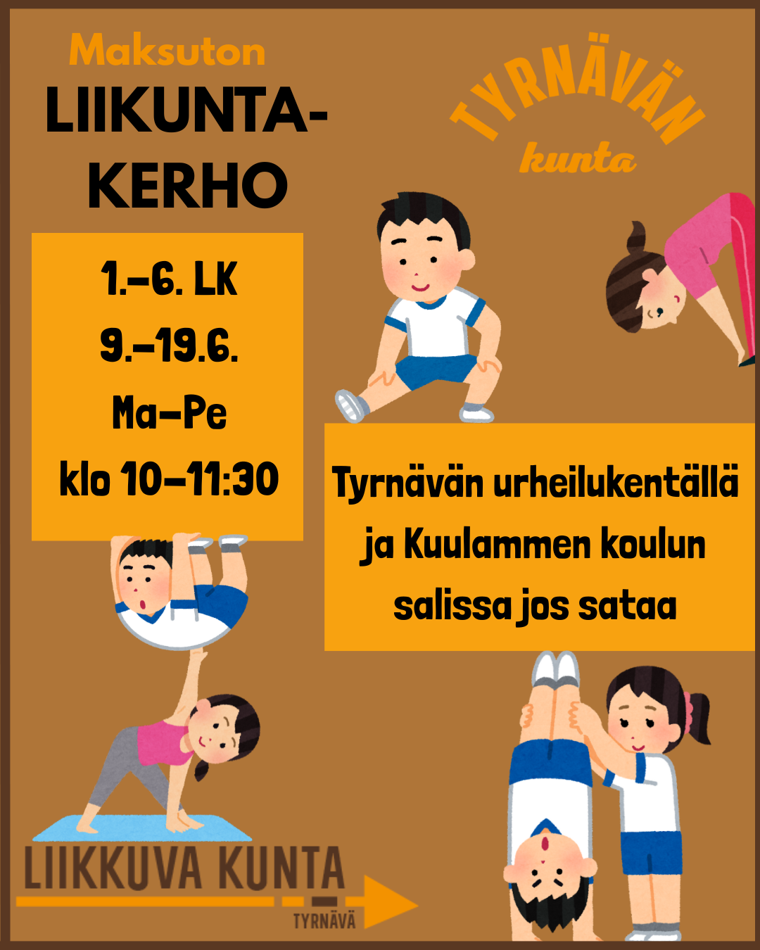 09.06.2025 10:00 - 19.06.2025 11:30 Lasten liikuntakerho Tervetuloa Tyrnävän kunnan liikkuvaan kesäkerhoon arkisin 9.- 19.6. Klo 10:00 - 11:30! 🤸 Kerho on suunnattu alakouluikäisille lapsille! 🤸 Kesäkerho järjestetään urheilukentällä ja sateen sattuessa Kuulammen koulun liikuntasalissa. 🤸 Ensimmäisellä viikolla kerhoa pitävät liikuntatoimen kesätyöntekijät Atro ja Aada. Kanssamme kerhoa pitää Tyrnävän nuorisotoimi. Myös 4H:n kesäkerholaiset ovat mukana menossa! 🤸 Kesäkerho on osallistujille maksuton. 🤸 Voit osallistua kerhoon kaikkina päivinä tai vain joinain päivinä, oman aikataulusi mukaan. Kerhoon ei tarvitse erikseen ilmoittautua. 🤸 Kerhoon ei sisälly ruokailua, mutta omat pienet eväät voi ottaa mukaan. Erityisesti kannattaa ottaa vesipullo matkaan. 🤸 Kokoonumme kunnantalon pihalle aina ennen kerhon alkua ja siirrymme siitä päivän liikuntapaikalle. 🤸 Otathan mukaan myös reipasta liikuntamieltä ja säänmukaiset varusteet.