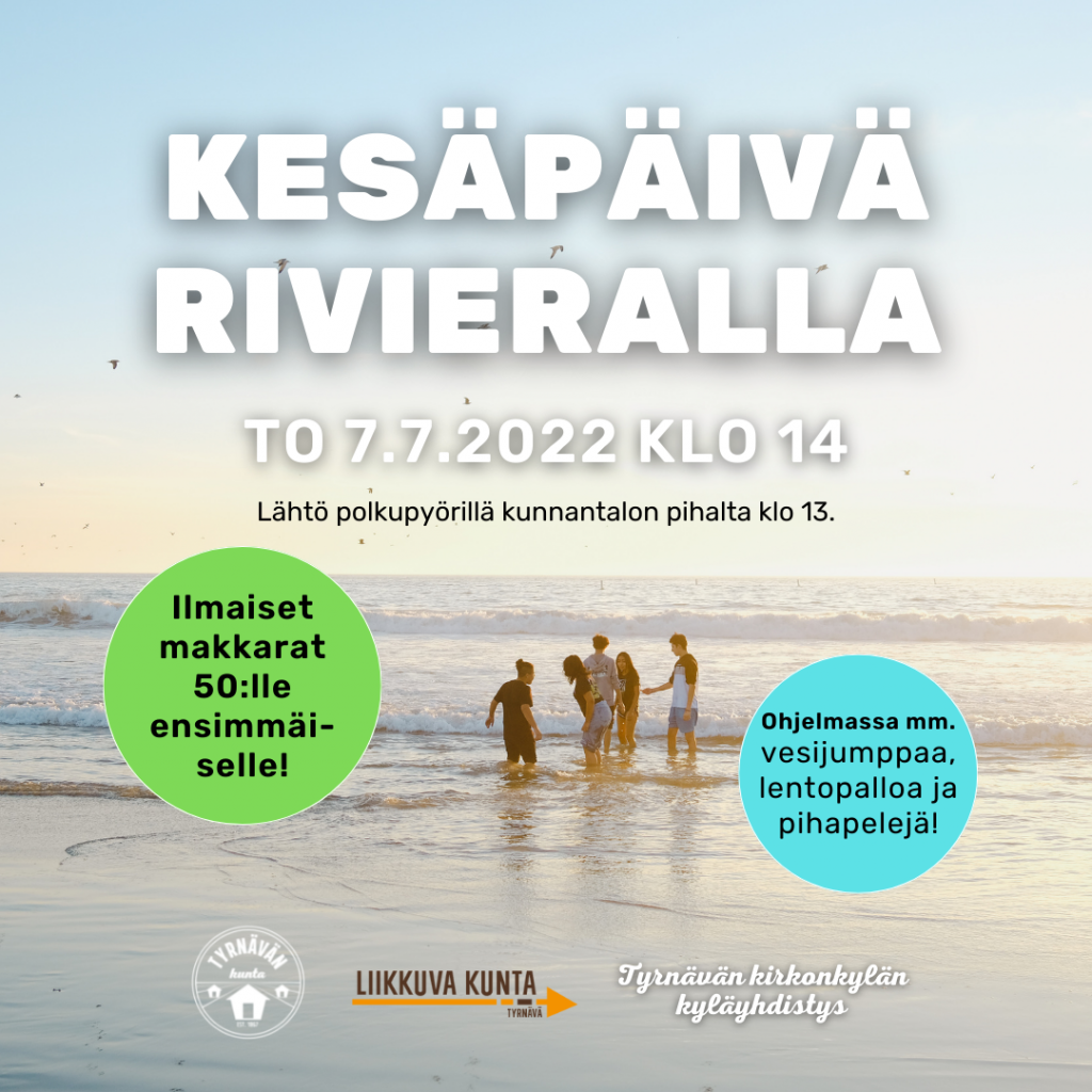 07.07.2022 14:00 - 07.07.2022 14:01 Liikunnallinen kesäpäivä Rauhionojan Rivieralla Tuu mukaan liikunnalliseen kesäpäivään Markkuun Rauhionojan Rivieralle torstaina 7.7. 🌞 Tapahtuma on kaikille avoin. Mukana on vesijumppaa, leikkimielistä kisailua, jne... Yhteislähtö pyörillä klo 13.00 kunnantalon pihalta taikka saa tulla autollakin suoraan paikan päälle. Tervetuloa! ️️️ Cafe Conrad on myös auki ja paluumatkalla kannattaa piipahtaa siellä kahvilla ja taidenäyttelyssä. Tyrnävän kirkonkylän kyläyhdistys toivottaa kaikille ihanaa kesää! 🌺 Jos olet kiinnostunut liittymään kyläyhdistykseen, otahan yhteyttä, niin kerromme lisää: 👉 p. 044 750 5051 / Annukka.