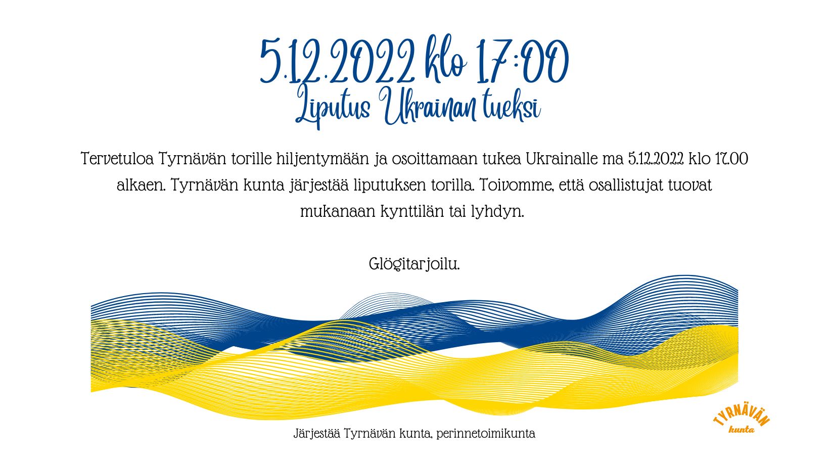 05.12.2022 17:00 - 05.12.2022 18:00 Liputus Ukrainan tueksi ma 5.12. klo 17 Tervetuloa Tyrnävän torille hiljentymään ja osoittamaan tukea Ukrainalle ma 5.12.2022 klo 17.00 alkaen. Tyrnävän kunta järjestää liputuksen torilla. Toivomme, että osallistujat tuovat mukanaan kynttilän tai lyhdyn. Glögitarjoilu. Järjestää Tyrnävän kunta, perinnetoimikunta У понеділок 5.12.2022 о 17.00 Комітет збереження звичаїв та традицій міста Тюрнява запрошує всіх мешканців та гостей міста прийняти участь у заході на підтримку Украйни та запалити свічки на вшанування пам'яті про всіх загиблих у ході війни. Місце проводження заходу – головна площа міста Тюрнявя. Просимо учасників заходу взяти із собою свічки та лампадки. Учасникам заходу буде запропоновано глінтвейн. Ласкаво просимо!