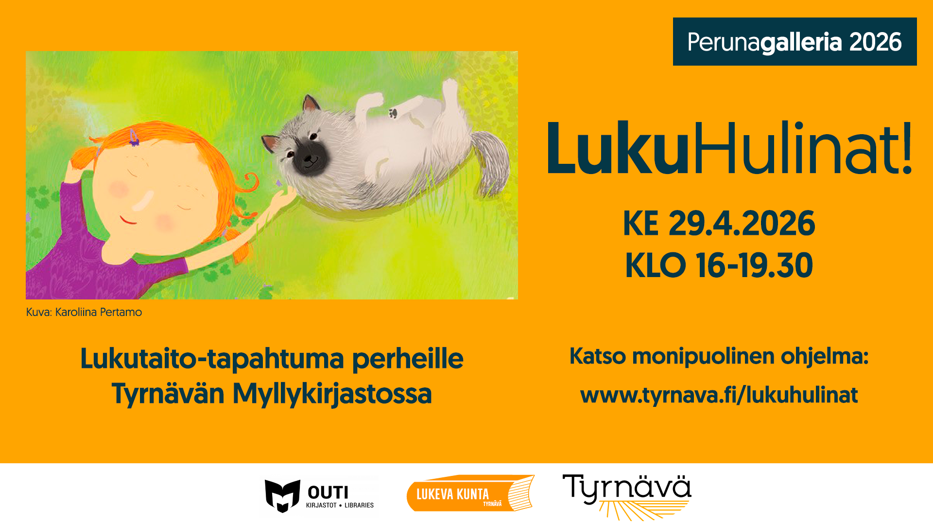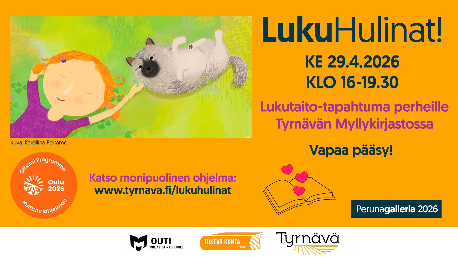 29.04.2026 16:00 - 29.04.2026 19:30 LukuHulinat! Koko perheen lukutaitotapahtuma Tyrnävän Myllykirjastossa ke 29.4.2026 klo 16-19.30 Myllykirjasto täytyy lukemisen riemusta ja keväisestä hulinasta Outi-kirjastojen yhteisen Reissurepun saapuessa Tyrnävälle 29.4.-4.5. väliseksi ajaksi LukuHulinat! LukuHulinat! -tapahtuma kirjastolla keskiviikkona 29.4. klo 16-19:30 Myllykirjasto täytyy lukemisen riemusta ja keväisestä hulinasta Outi-kirjastojen yhteisen Reissurepun saapuessa Tyrnävälle 29.4.-4.5. väliseksi ajaksi Tule sellaisena kuin haluat, vaikka naamiaisasussa! Yrittäjyysluokan kahvio palvelee Kivipirtissä klo 16-19:30. Taiteile kortti läheisellesi runokorttityöpajassa ja jätä lukemiseen liittyvä viesti reissureppuun! Toukokuun lopussa reppu terveisineen luovutetaan kulttuuripäättäjille Hailuodon tapahtumassa. Nukketeatteri Akseli Klonkin esitys Avain hukassa kirjaston lehtisalissa klo 17:30. Esitys kestää 40 min. Monia tunnettuja lastenkirjoja kuvittanut ja kirjoittanut Karoliina Pertamo kertoo kuvakirjan tekemisestä kello 18:30 kirjaston lehtisalissa. Paljon mukavaa oheisohjelmaa, mm. koiria rapsuteltavana. Arvontaa! Kaikki ja kaikenikäiset kuntalaiset ovat tervetulleita tapahtumaan! Vapaa pääsy, tervetuloa! Reissureppu kiertää kaikki OUTI-kirjastokimpan kunnat, aloittaen Kuusamosta ja päätyen Hailuotoon. Jokaisessa kunnassa reppu pysähtyy kolmen arkipäivän ajan. Sinä aikana paikallinen kirjasto järjestää lukemiseen ja lukemisen edistämiseen liittyvän tapahtuman ja kerää reppuun paikallisia terveisiä. Toukokuun alussa reppu terveisineen luovutetaan kulttuuripäättäjille Hailuodon tapahtumassa. Lue lisää Oulu2026 -tapahtumakalenterista. Tyrnävällä Reissureppu pysähtyy 29.4.–4.5.2026. Tyrnävältä reppu siirtyy Liminkaan Petran hevostoiminnan ja Hilma-hevosen kuljettamana 4.5.2026. Pysy kuulolla!