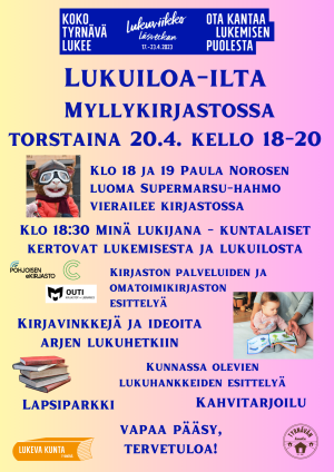 20.04.2023 18:00 - 20.04.2023 20:00 Lukuiloa-ilta Myllykirjastossa Lukuiloa-ilta on koko perheen tapahtuma, josta löydät kirjavinkkejä ja ideoita arjen lukuhetkiin. Kello 18 ja 19 Paula Norosen luoma Supermarsu-hahmo vierailee kirjastossa Kello 18.30 Minä lukijana – kuntalaiset kertovat lukukokemuksistaan sekä lukuilosta Kirjaston palveluiden ja omatoimikirjaston esittelyä Kunnan lukuhankkeiden esittelyä Kahvitarjoilu Vapaa pääsy, tervetuloa!