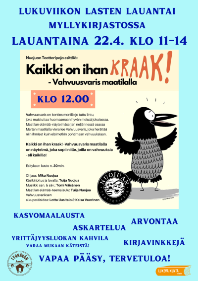 22.04.2023 11:00 - 22.04.2023 14:00 Lukuviikon Lasten lauantai Myllykirjastossa kello 11–14 Myllykirjaston Lasten lauantai kello 11–14. Kirjavinkkejä, kasvomaalausta, arvontaa ja askartelua. Kuulammen koulun yrittäjyysluokan pop up -kahvila koko tapahtuman ajan. Varaa siis mukaan myös käteistä rahaa! Kello 12.00 Nuojuan Teatteripaja esittää Kaikki on ihan KRAAK! – Vahvuusvaris maatilalla -näytelmän. Tapahtumaan on vapaa pääsy, tervetuloa!