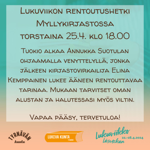 25.04.2024 18:00 - 25.04.2024 19:00 Lukuviikon rentoutustuokio Myllykirjastossa Lukuviikon rentoutushetki Myllykirjastossa torstaina 25.4. klo 18:00. Tuokio alkaa Annukka Suotulan ohjaamalla venyttelyllä ja jatkuu Elina Kemppaisen ääneen lukemalla rentouttavalla tarinalla. Mukaan tarvitset oman alustan ja halutessasi myös viltin. Vapaa pääsy, tervetuloa!
