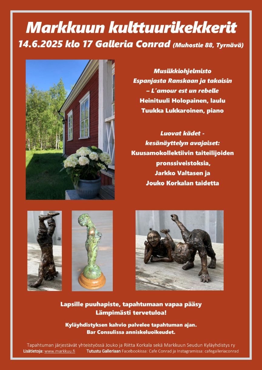 14.06.2025 17:00 - 14.06.2025 20:00 Markkuun Kulttuurikekkerit ja kesänäyttelyn avajaiset Tervetuloa Markkuun Kulttuurikekkereille tunnelmalliseen Café & Galleria Conradiin lauantaina 14.6.2025 klo 17.00! Luvassa upeaa musiikkia sekä kesänäyttelyn avajaiset. Tänä vuonna esillä on Kuusamokollektiivin taiteilijaryhmän pronssiveistoksia ja Jarkko Valtasen grafiikkaa. Tapahtuman järjestävät Markkuun Seudun Kyläyhdistys ja Jouko ja Riitta Korkala.
