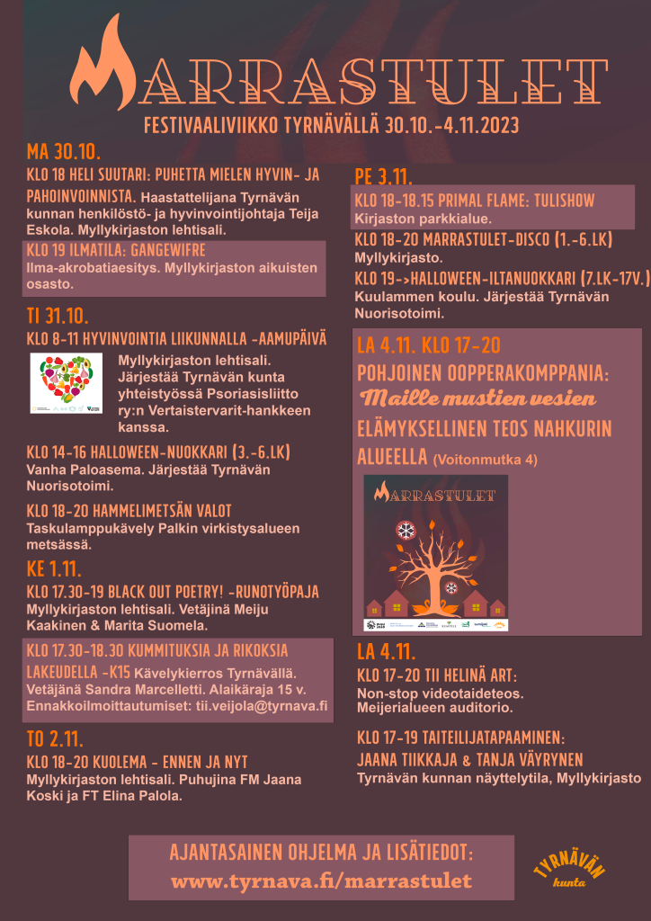 30.10.2023 12:00 - 04.11.2023 20:00 Marrastulet -festivaali Tyrnävällä 30.10.-4.11.2023 Marrastulet-festivaali tuo valoa vuoden pimeimpään aikaan! Festivaalia vietetään Tyrnävällä viikon verran 30.10.-4.11.2023. Festivaaliviikon päiväkohtaiset tapahtumat sekä lisätiedot tapahtumien osalta löydät tapahtumakalenterista omilta sivuiltaan. Tapahtumiin on vapaa pääsy, tervetuloa! Tyrnävällä festivaalin päätapahtumaa vietetään lauantaina 4.11. klo 17-20, kun Tyrnävän nahkatehtaan (Voitonmutka 4) ympäristöön rakentuu muutamaksi tunniksi kaikkien koettava elämyksellinen teos, jonka toteuttaa Pohjoinen Oopperakomppania. Teos on rakentunut paikallisten tarinoiden ja legendojen pohjalle. Tyrnävän teokseen Pohjoisen oopperakomppanian jäsenet ovat haastatelleet 7.6. Pömilän ja 16.8. Sippibaarin aamukahvilla istunutta paikallista väkeä. Tapahtuma on osa Oulun kulttuurisäätiön eli Oulu2026:n koordinoimaa Valon kuukautta.