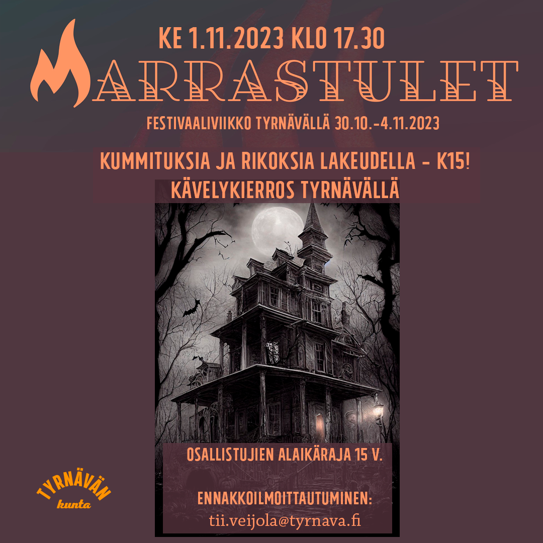 01.11.2023 17:30 - 01.11.2023 18:30 Marrastulet-festivaalien ohjelmaa: Ke 1.11. klo 17.30-18.30 Kummituksia ja rikoksia lakeudella - K15! Kävelykierros Tyrnävällä TÄYNNÄ! Marrastulet-festivaalien ohjelmaa: Ke 1.11. klo 17.30-18.30 Kummituksia ja rikoksia lakeudella - K15! Kävelykierros Tyrnävällä. HUOM! KIERROS ON TÄYNNÄ! Kierroksen vetäjänä Sandra Marcelletti. Lähtöpaikka Pömilän edusta. Kierros päättyy Esinemuseolle, jossa Tyrnävän kirkonkylän kyläyhdistys tarjoaa osallistujille kuumaa juotavaa. HUOM! Ennakkoilmoittautuminen, mukaan mahtuu 12 ensimmäistä! Ilmoittautumiset: tii.veijola@tyrnava.fi Osallistuminen on maksutonta. Osallistujien toivotaan ottavan mukaansa taskulampun tai otsalampun. Valitettavasti kävelykierros ei ole esteetön johtuen esinemuseo-käynnistä. Festivaalin koko ohjelma: www.tyrnava.fi/marrastulet