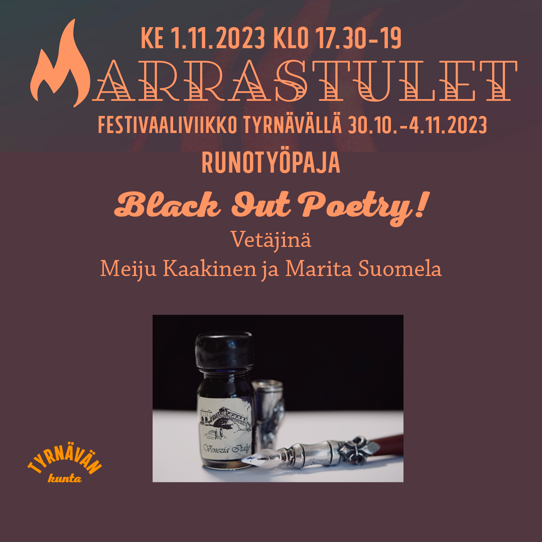 01.11.2023 17:30 - 01.11.2023 19:00 Marrastulet-festivaalien ohjelmaa: Ke 1.11. klo 17.30-19 Black Out Poetry! -runotyöpaja Marrastulet-festivaalien ohjelmaa: Ke 1.11. klo 17.30-19 Black Out Poetry! -runotyöpaja Myllykirjaston lehtisalissa. Vetäjinä Meiju Kaakinen ja Marita Suomela. Vapaa pääsy, tervetuloa! Festivaalin koko ohjelma: www.tyrnava.fi/marrastulet