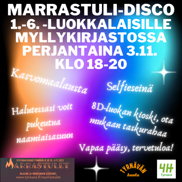 03.11.2023 18:00 - 03.11.2023 20:00 Marrastulet-festivaalien ohjelmaa: Pe 3.11.2023 klo 18-20: Marrastulet-disco Myllykirjastolla 1.-6.-luokkalaisille Marrastulet-festivaalien ohjelmaa: Pe 3.11.2023 klo 18-20 Marrastulet-disco Myllykirjastolla 1.-6.-luokkalaisille! Vapaa pääsy, tervetuloa! Festivaalin koko ohjelma: www.tyrnava.fi/marrastulet