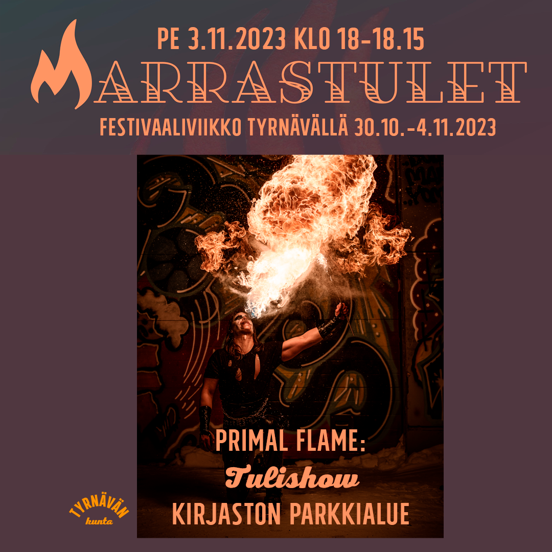 03.11.2023 18:00 - 03.11.2023 18:15 Marrastulet-festivaalien ohjelmaa: Pe 3.11.2023 klo 18: Primal Flame: Tulishow! Kirjaston parkkialueella Marrastulet-festivaalien ohjelmaa: Pe 3.11.2023 klo 18: Primal Flame: Tulishow Supersuosion Tyrnävän Taiteiden yössä saavuttanut tulitaiteilija Veikko Mikkonen alias Primal Flame saapuu jälleen Tyrnävälle. Luvassa huikea tulishow pimeässä marraskuun illassa! Kirjaston parkkialue. HUOM! Yleisön on ehdottomasti noudatettava turvaväliä ja yleisiä turvallisuusohjeita esityksen aikana! Vapaa pääsy, tervetuloa! Seuraa Instagramissa: @primalflame Festivaalin koko ohjelma: www.tyrnava.fi/marrastulet