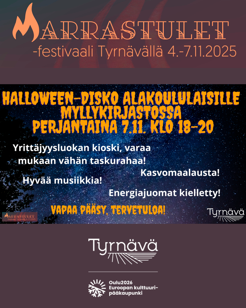 07.11.2025 18:00 - 07.11.2025 20:00 Marrastulet-festivaalin ohjelmistoa: Halloween-disco alakoululaisille. Pe 7.11.2025 klo 18–20 Myllykirjaston lehtisalissa. Halloween-disco alakoululaisille Myllykirjastossa pe 7.11.2025 klo 18–20 Yrittäjyysluokan kioski, varaa mukaan vähän taskurahaa! Hyvää musiikkia! Kasvomaalausta Energiajuomat kielletty Vapaa pääsy, tervetuloa! HUOM! Halloween-discon vuoksi omatoimikirjasto ei ole käytössä pe 7.11.2025 klo 16-21.